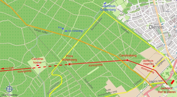 Vanaf het Hof te Dieren (vanaf de Koningsmuur), vanaf de Rijksweg/ Ellecommerstraat/ Ellecommerlaan/Arnhemsestraatweg, liep de Koningsweg (Koningslaan) naar het jachthuis Hagenau. Vandaar liep de weg verder naar de Carolinaberg, vervolgens naar de Prins Willemberg en verder naar de Carolinahoeve. Tot aan de Koepel van Viruly is de Koningsweg min of meer te volgen.