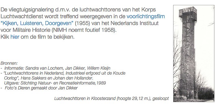 Het voormalige Korps Luchtwachtdienst (K.L.D.) was verantwoordelijk voor de vliegtuigsignalering en zorgde per regio voor de vrijwilligers om de torens te bemannen.